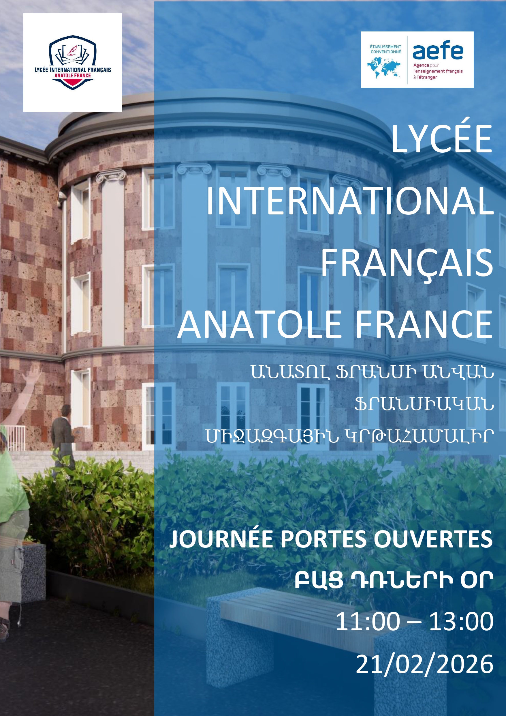 🇦🇲 2026 թվականի փետրվարի 21-ին՝ շաբաթ օրը, առավոտյան 11։00-ին Անատոլ Ֆրանսի անվան ֆրանսիական միջազգային կրթահամալիրի դռները բաց կլինեն բոլորի համար: