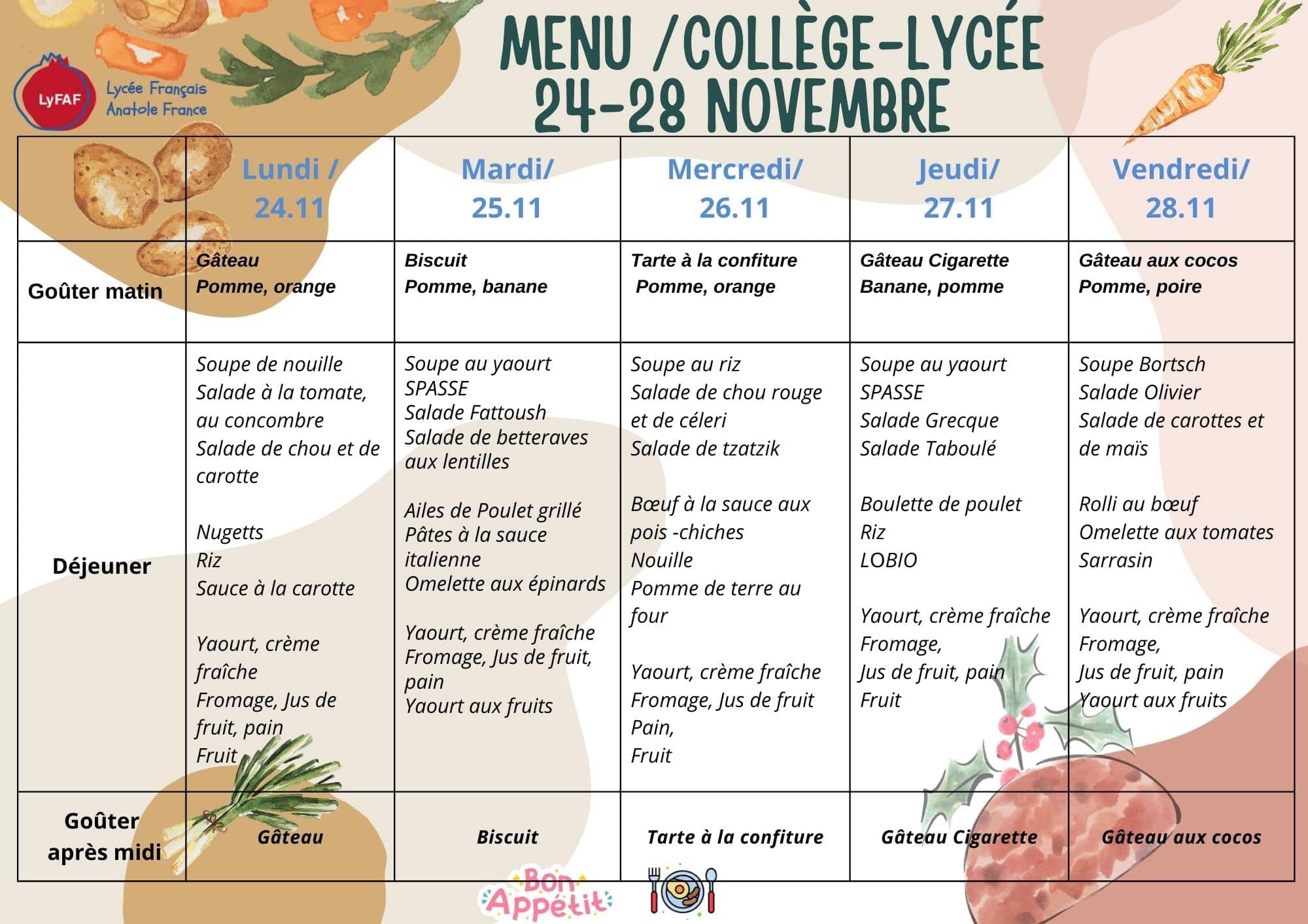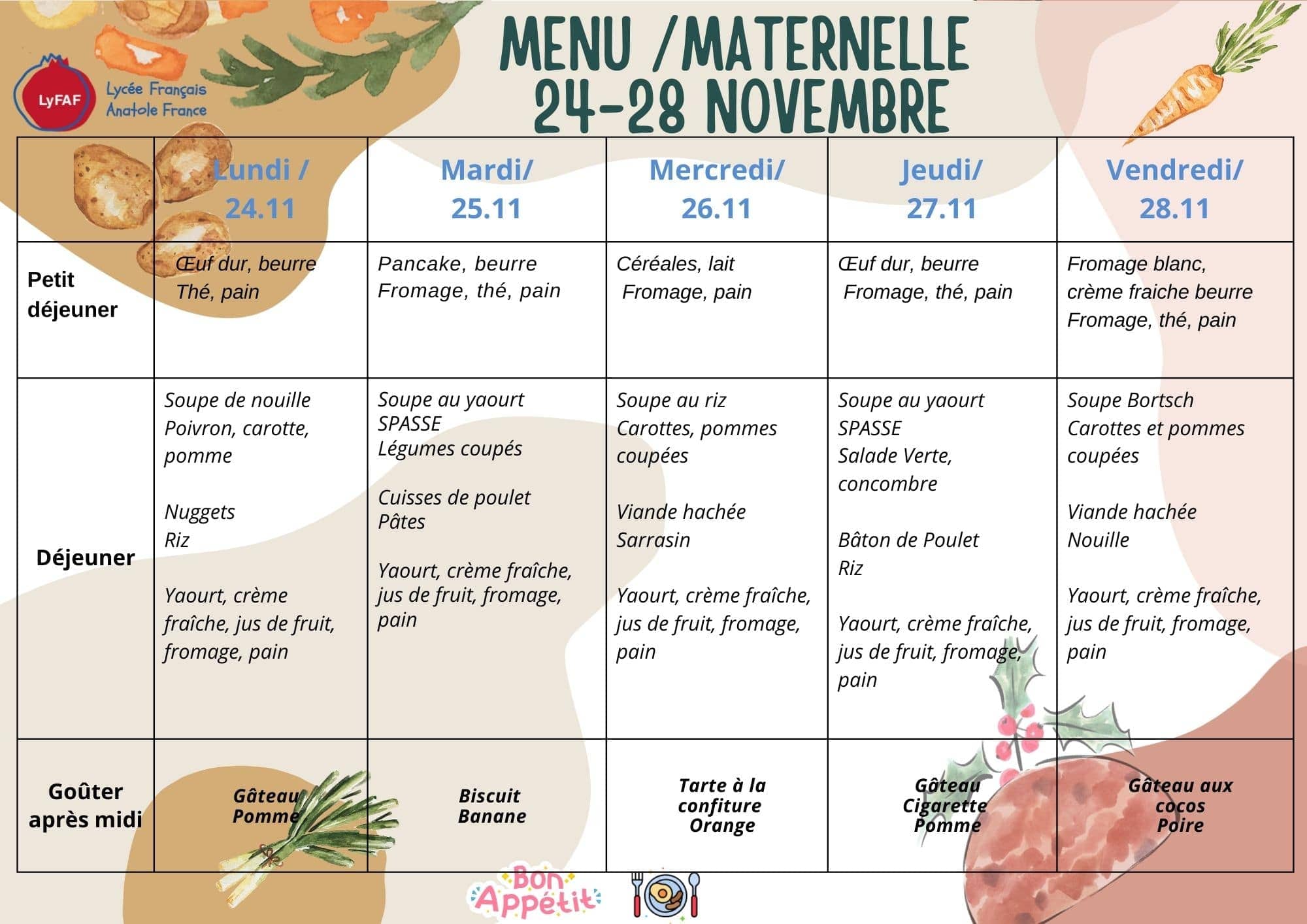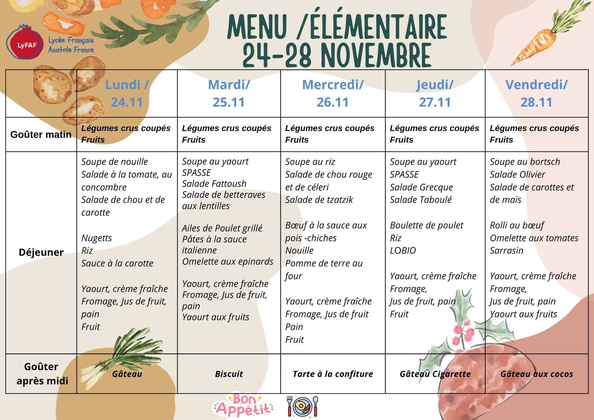 | Afternoon snack | 15h55-16h10 |