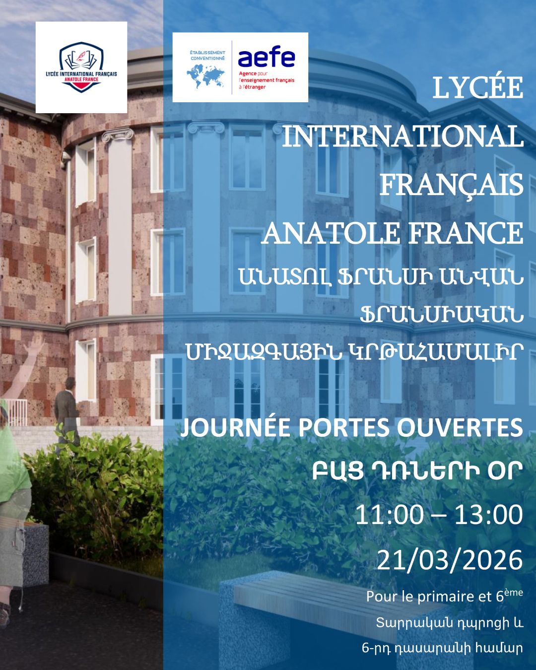 🇦🇲 2026 թվականի մարտի 21-ին ՝ շաբաթ օրը, առավոտյան 11։00-ին Անատոլ Ֆրանսի անվան ֆրանսիական միջազգային կրթահամալիրը կազմակերպում է Բաց դռների օր տարրական դպրոցի և 6-րդ դասարանի համար: