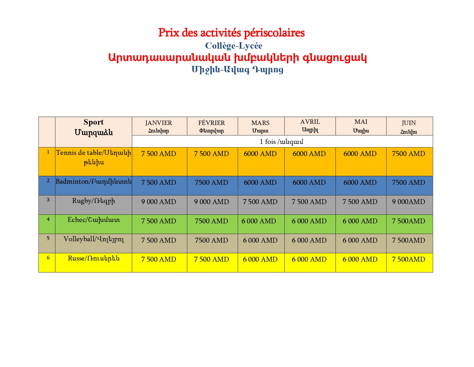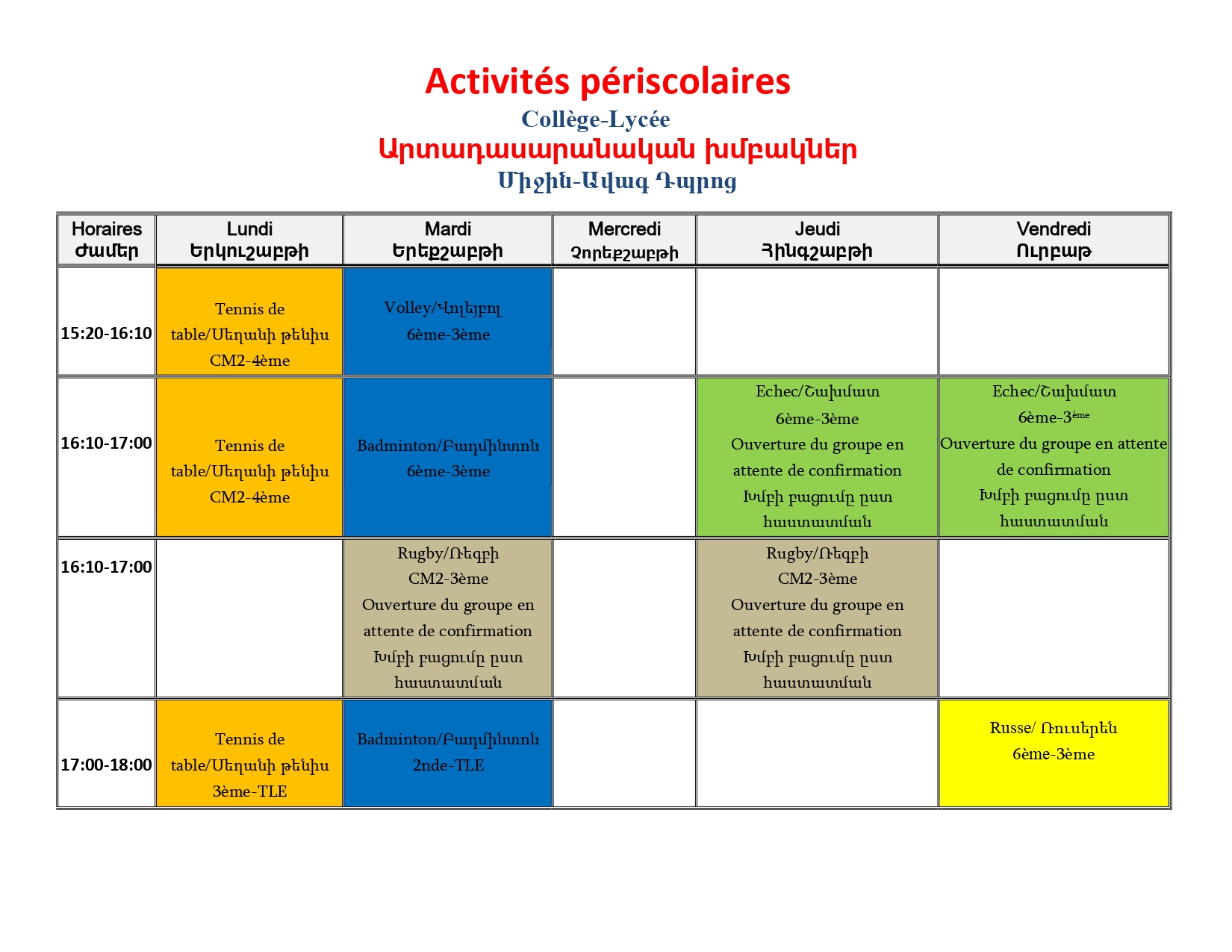 Pour toute question relative aux paiements des activités périscolaires veuillez écrire à: ani_kivrikyan@lyceefrancais.am