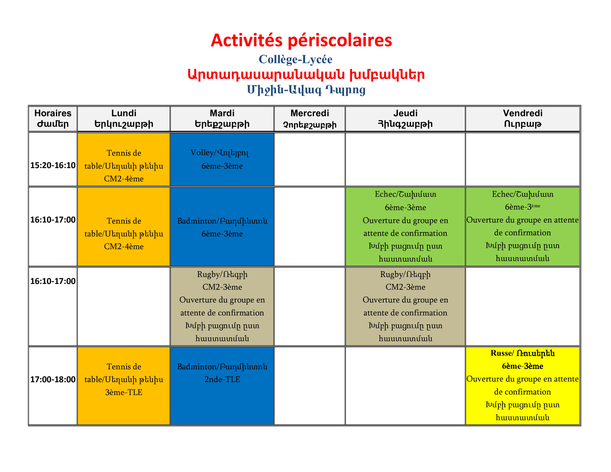 Հարցերի և պարապմունքների դադարեցման դեպքում խնդրում ենք դիմել դպրոցական կյանքի թիմին՝ perisco@lyceefrancais.am